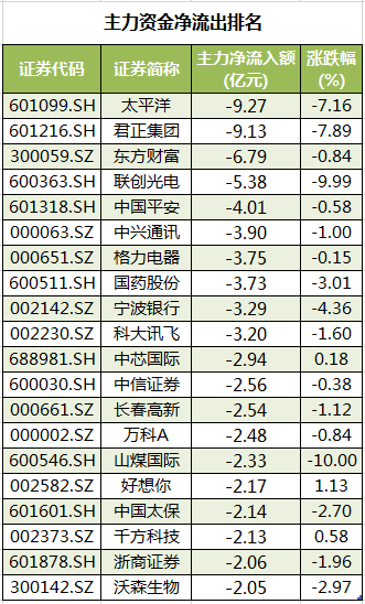 此外,72股被主力资金净卖出超亿元。其中,太平洋、君正集团、东方财富、联创光电、中国平安主力资金净流出较多,净流出金额分别为9.27亿元、9.13亿元、6.79亿元、5.38亿元、4.01亿元。