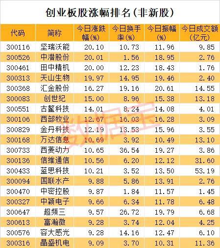 由于创业板涨跌幅限制扩大至20%,今日创业板股的表现格外引人注目。从盘后数据来看,不含今日18只新股在内,创业板股平均振幅达到6.66%,高出A股平均振幅1.33个百分点,豫金刚石(维权)、华谊嘉信(维权)、华鹏飞、汇金股份等4股振幅超过20%。与以往10%便达到涨停价不同,今日涨停的创业板股数量大幅下滑,收盘时涨停股仅剩4只,分别是坚瑞沃能、中潜股份(维权)、田中精机、天山生物(维权)。