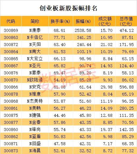 从盘中波动来看,18只创业板新股首日平均振幅为224.97%。涨幅第一的康泰医学也是盘中震荡最明显的股票,今日振幅高达2538.58%。不过除康泰医学、卡倍亿、天阳科技、南大环境外,其余新股今日振幅均未超过100%。