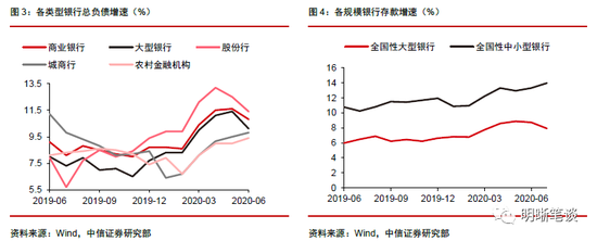 大型银行的负债端压力有所显现。从6月末各类银行总资产负债数据中,也可以发现大型银行负债端压力的增大在半年末就以初见端倪。我们在前期报告《债市启明系列20200805—如何看待同业存单发行利率走高?》中对商业银行稳定负债的缺乏以及同业存单发行利率中枢的升高进行了提示,从总负债变化数据中看,上半年持续推进的“宽小微信用”使得大型银行、股份制银行存款募集难度有所上升(小微企业存款业务可能更多的和城商行、农商行等规模相对较小的银行合作)。商业银行负债端增速的下降可能会对2020年下半年信贷投放产生一定限制,从而进一步影响银行收入流的增长。