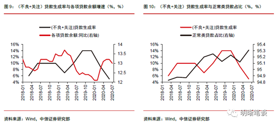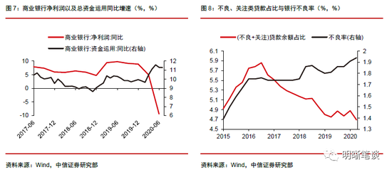 银行资产质量后续如何演绎:预计后市不良资产逐渐暴露但总体可控。从银保监会当前公布的数据看,二季度不良贷款增加了约1200亿元,单季不良贷款核销了约2900亿元,但这些不良贷款并非完全由正常类信贷形成,二季度关注类贷款也减少了约1700亿元,部分关注类贷款也被确认为不良,因此目前商业银行体系出于审慎考虑正处于“加大力度确认不良+加大不良核销水平”的状态。我们预计从商业银行体系整体来看,这种情况还会维持一段时间。相较不良贷款占比,不良贷款与关注类贷款占新增信贷的比例更能反映不良的动态变化;在信贷增速高增期,由于贷款增量大且政策托底力度强,不良类信贷生成的速度将会下降;我们已经在前期报告《债市启明系列20200813—为什么我们认为下半年信用增速会放缓?》阐述过下半年信贷投放节奏将放缓的逻辑,从这个视角看,下半年商业银行不良类贷款生成率可能会升高(既可能来自不良贷款的不断暴露也来自新增贷款增量的减少)。不良贷款生成率的上移会导致不良率的上升,如果商业银行继续维持当前的不良处置速度,那么下半年由多计提拨备导致的利润增速下探可能仍将继续。