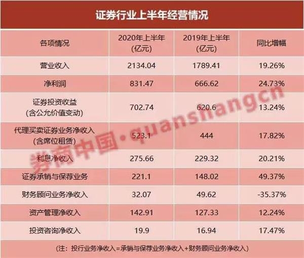 今年上半年,受益于资本市场上涨以及利好政策叠加等因素影响,证券业业绩亮眼。134家证券公司上半年共实现营收2134.04亿元,同比增长19.26%;实现净利润831.47亿元,同比增长24.73%。