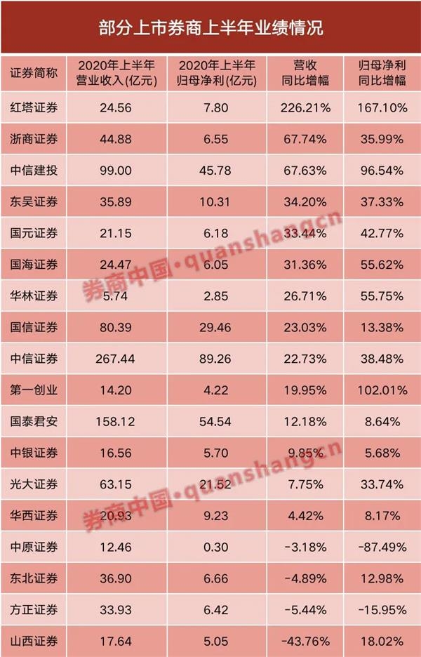 浙商证券、中信证券上半年营收同比增幅均超过60%,其中中信建投证券99亿元的营收同比增幅67.63%,在大券商中增幅十分亮眼;此外,中信建投证券以45.78亿元的归母净利润实现了96.54%的同比增幅,有券商分析师直言“比预期中还要好”。