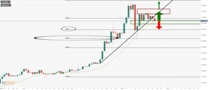 而对白银而言,其价格正在测试下方的上升动态趋势线支撑位。不过,有一个支撑结构可以支撑价格,从而导致看跌的假突破。这一价格很可能会回到28美元/盎司的水平,并激励多头重新进场。另一方面,跌破支撑结构导致价格存在跌至38.2%的斐波那契回撤位和7月底交易的前阻力位的风险。但总体而言,在50%均值回归水平之上,技术面仍看涨。