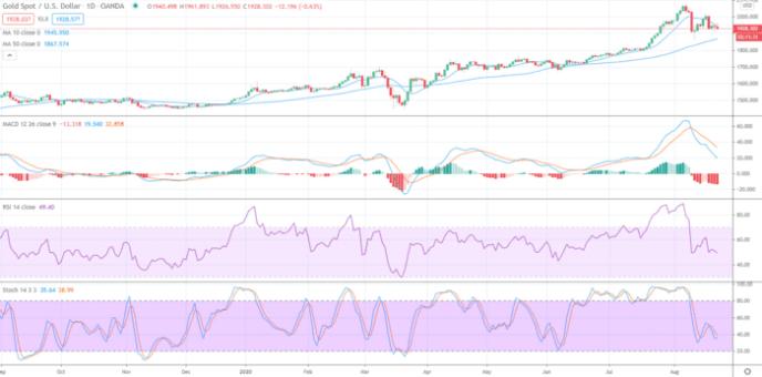 从技术面上看,金价小幅下跌,并继续巩固。价格未能在10日移动均线1928美元/盎司附近重获支撑。目标支撑位预计在50日移动均线切入位1867美元/盎司附近。中期动能仍为负面,MACD柱呈红色,下滑轨迹指向较低价格。短期动能已转为负面,因快速随机产生交叉卖盘信号,并继续加速下行。相对强弱指数(RSI)也被打破,反映出负动能加速。