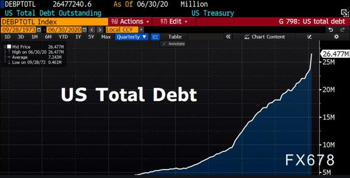 这就是美国正在发生的事情。到2020年,美国债务与经济产出(债务/GDP)可能会超过120%(甚至可能高达130%)。尽管可以部分将原因归咎于疫情,但美国债务一直在稳步上升却已经是很久之前的事情。早在疫情爆发之前,美国在经济萧条时期和经济繁荣时期就已经存在巨额预算赤字。