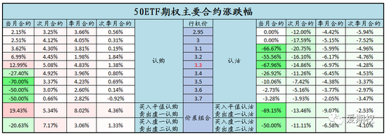 价差组合、跨式空头获利。今日在标的上涨行情下,实值认购普遍收涨,当月虚值认购合约由于即将到期,价格几近归零,远月虚值认购期权受隐含波动率下降影响价格也有所下跌,牛市价差组合、跨式空头再度获利。