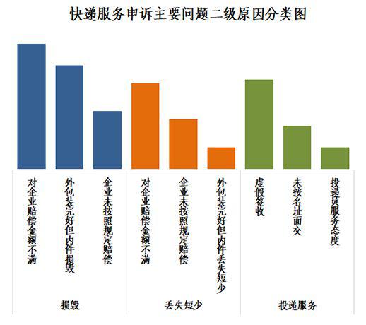 邮件延误申诉中主要占比是中转或运输延误,投递服务申诉中主要占比是未按名址面交,邮件丢失短少申诉中主要占比是对企业赔偿金额不满。