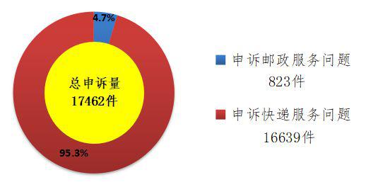 申诉中涉及邮政服务问题的823件,占总申诉量的4.7%,环比增长57.4%,同比下降67.6%;涉及快递服务问题的16639件,占总申诉量的95.3%,环比增长46.8%,同比下降70.2%。