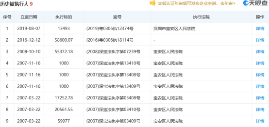 相关信息显示,2007年至2019年,该公司曾9次成为被执行人。报告期内,该公司分别于2016年和2019年成为被执行人。