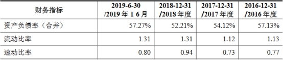 2016年末、2017年末、2018年末和2019年1-6月末,兆威机电流动比率分别为1.13、1.12、1.31和1.31;速动比率分别为0.77、0.73、0.94和0.80;资产负债率(合并)分别为57.13%、54.12%、52.21%和57.27%。