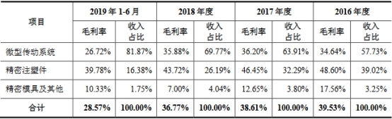 2016年、2017年、2018年和2019年1-6月,兆威机电主营业务综合毛利率分别为39.53%、38.61%、36.77%和28.57%,呈逐年下降的趋势。