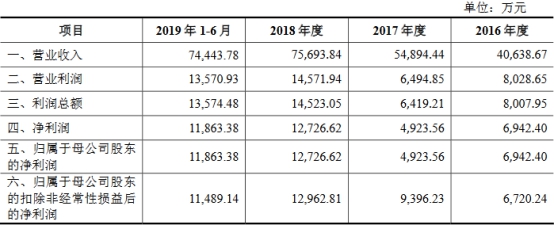 2016年、2017年、2018年和2019年1-6月,兆威机电实现营业收入分别为4.06亿元、5.49亿元、7.57亿元和7.44亿元;实现净利润分别为6942.40万元、4923.56万元、1.27亿元和1.19亿元。