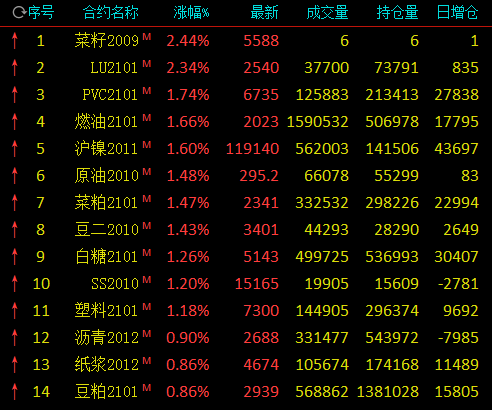 热点栏目8月26日,国内期市早盘涨跌互现,能化飘红,低硫燃油涨逾2%,PVC、燃油涨近2%,原油涨逾1%;粕类走升,菜粕、豆二涨逾1%,豆粕涨近1%,白糖涨逾1%,苹果跌1%;黑色系飘绿,热卷跌逾1%;有色中,沪镍涨1.6%,沪铅跌逾1%。