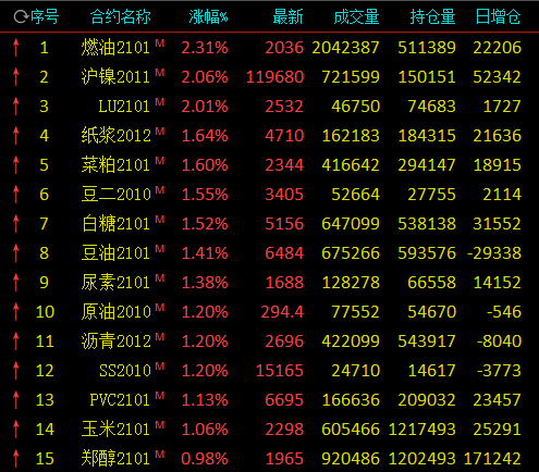 热点栏目8月26日,国内期市收盘涨跌不一,能化品多数上涨,燃油、低硫燃油涨逾2%,纸浆涨近2%,原油、沥青涨逾1%;油脂油料走升,菜粕、豆二、豆油涨逾1%;有色分化,沪镍涨逾2%,沪铅跌逾1%。