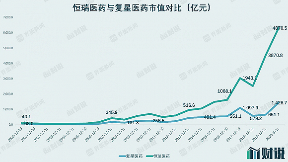 但从市值角度考虑,复星医药却未跻身医药第一梯队,远远被4800亿元市值的恒瑞医药甩开。2000年恒瑞医药上市时市值为40亿元,同期复星医药总市值达68亿元。随后接近20年的时间里,两家公司发生很大变化,目前恒瑞医药市值是复星医药的三倍。