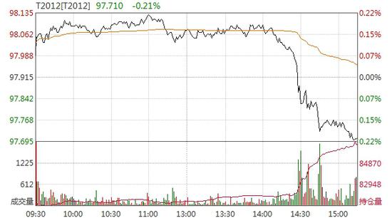 国债期货高开后窄幅震荡,午后临近尾盘转跌,10年期主力合约跌0.21%报97.71元,5年期主力合约跌0.20%报99.61元,2年期主力合约跌0.06%报100.195元,均创2019年12月20日以来新低。