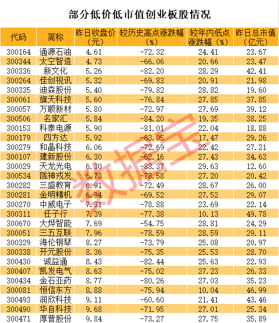 分析这些大幅飙升的创业板股可以发现,它们多具备在低价、低市值、超跌等特征。证券时报·统计显示,昨日收盘价低于10元、市值在50亿元以下、最新价较历史最高价下跌50%以上且较年内低点涨幅不足30%的创业板个股,合计共有29只。