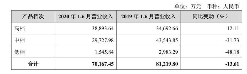 根据公告显示,按产品档次划分,金徽酒低档产品实现销售收入1545.84万元,同比下降48.18%;高档产品实现销售收入3.89亿元,同比增加12.11%。