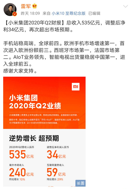 财报显示,2020年上半年,小米集团的总收入达到1032.4亿元,同比增长7.9%;经调整净利润达到56.74亿元,同比微降0.7%。其中,第二季度小米收入达到535.38亿元,同比增长3.1%;经调整净利润为33.73亿元,同比下降7.2%。