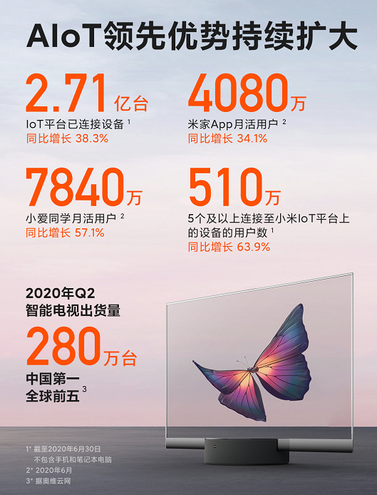 截至2020年6月30日,IoT平台已连接的IoT设备(不包括智能手机及笔记本电脑)数量达到2.71亿台,同比增长38.3%。在今年年6月,人工智能语音助理“小爱同学”有7840万名月活跃用户,同比增长57.1%,最活跃的人工智能语音交互平台之一。还有,米家App月活跃用户数量达到4080万,同比增长34.1%。