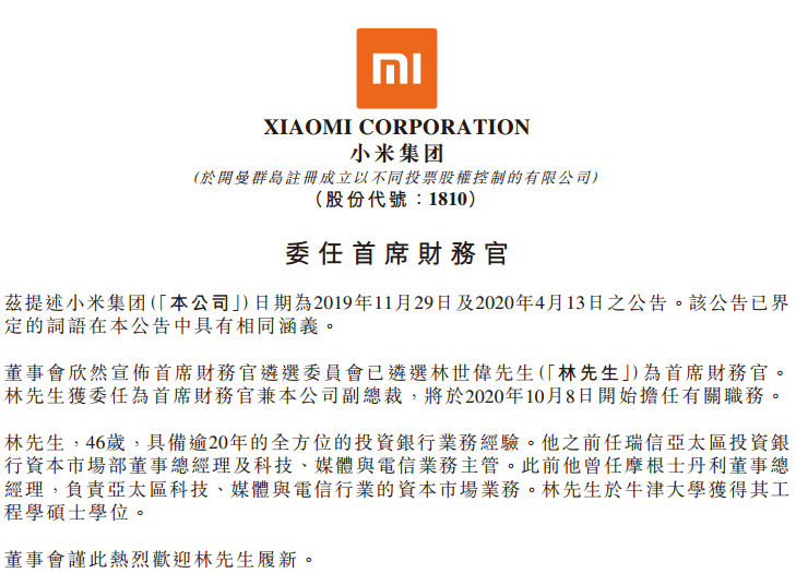 值得注意的是,8月26日在公布财报的同时,小米集团还公布了新任CFO人选,林世伟被任命为小米首席财务官兼副总裁,从2020年10月8日开始担任。46岁的林世伟是牛津大学工程学硕士,此前任瑞信亚太区投资银行资本市场部董事总经理及科技、媒体与电信业务主管;此前他还担任摩根士丹利董事总经理。