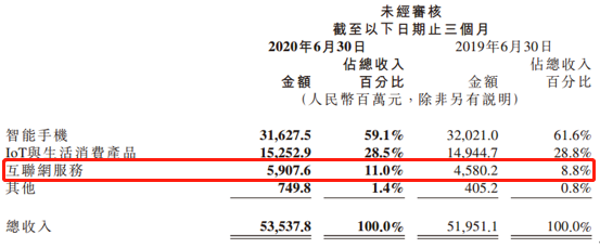 值得注意的是,在第二季度535亿元的收入中,智能手机316.28亿元,占比59.1%;IoT与生活消费产品152.53亿元,占比28.5%;互联网服务59.08亿元,占比11%,比去年同期占比明显上升。