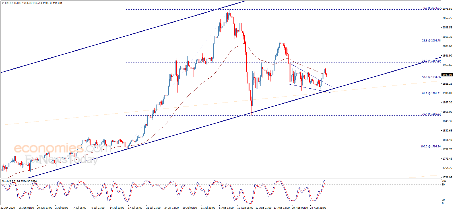 Economies.com预计,今日金价交投将位于支撑位1920.00美元/盎司以及阻力位1970.00美元/盎司之间。