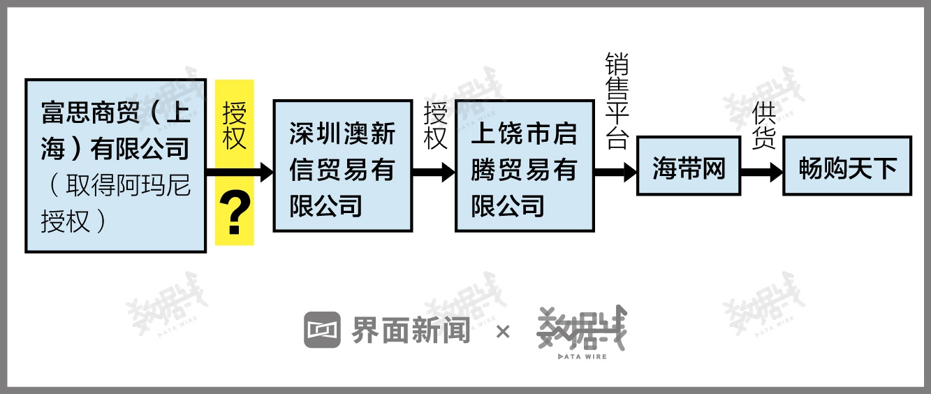根据畅购天下提供给消费者的信息,手表供应商是另一家电商平台海带网。而实际上,在海带网上销售阿玛尼手表的是上饶市启腾贸易有限公司,该公司的销售授权来自深圳澳新信贸易有限公司,深圳澳新信又表示是拿到了富思商贸(上海)有限公司的授权。