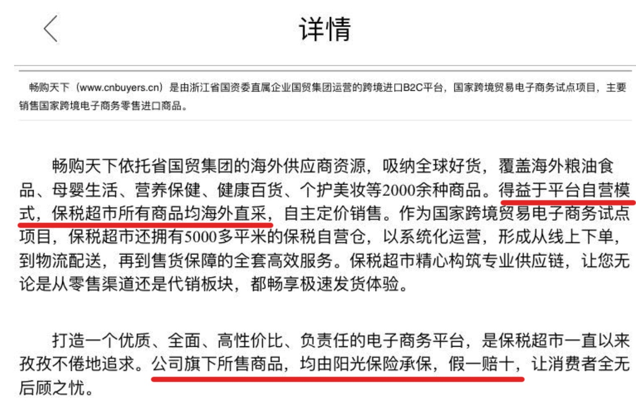 另外,畅购天下在修改前的网站介绍中提到,“公司旗下所售商品,均由阳光保险承保,假一赔十”。目前这句话在网站介绍上也已经消失。