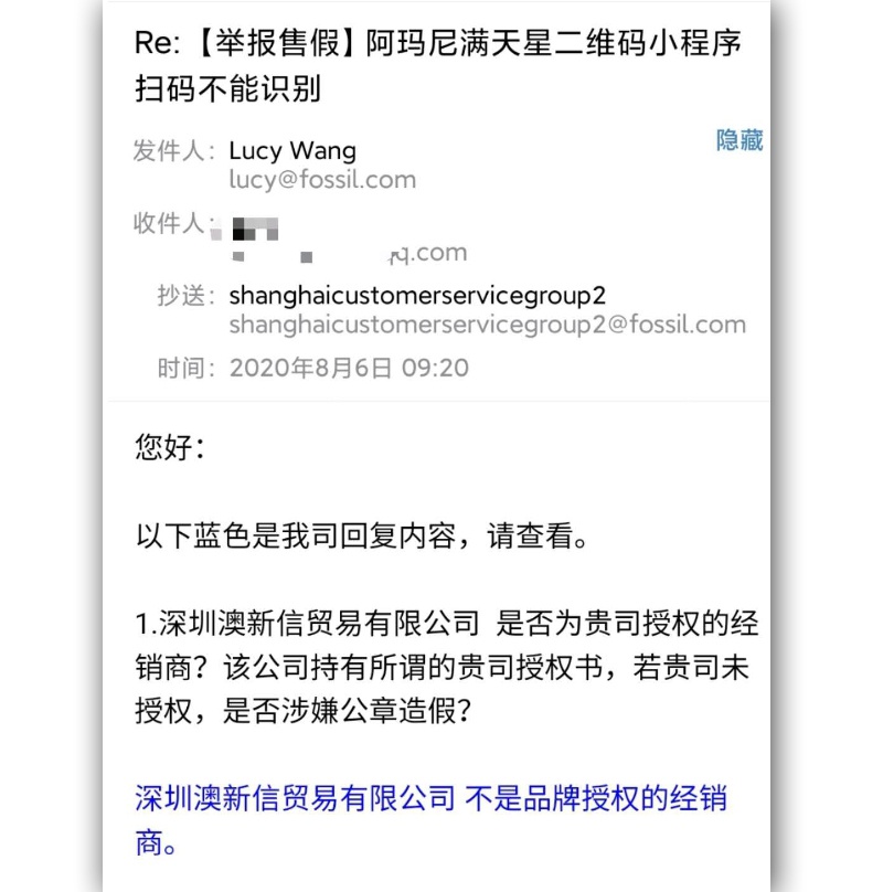 一位消费者向富思商贸发去邮件,询问深圳澳新信是否为公司的授权商,得到答复“不是品牌授权的经销商”。