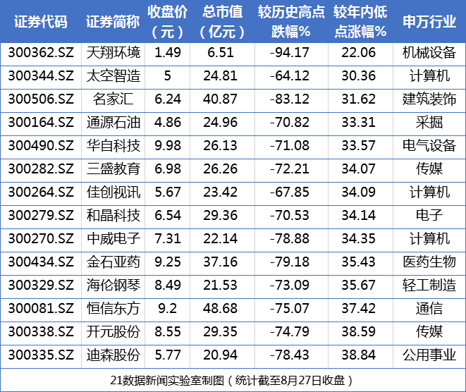 21数据新闻实验室统计显示,今日收盘价低于10元、市值在50亿元以下、最新价较历史最高价下跌50%以上且较年内低点涨幅不足40%的创业板个股,合计共有29只。