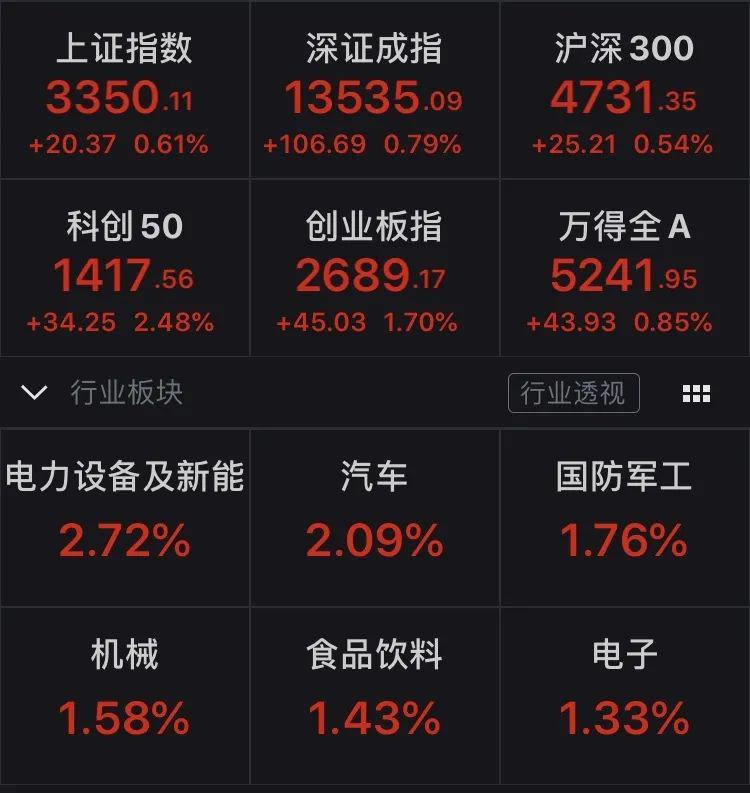 截至收盘,沪指上涨0.61%,收报3350.11点,深成指上涨0.79%,收报13535.09点,创业板指上涨1.70%,收报2689.17点。