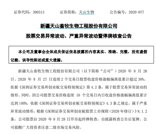 同日,天山生物发布公告称,因公司股票交易价格连续10个交易日内日收盘价格涨幅偏离值累计达到100%,属于严重异常波动情形,公司股票自8月28日开市起停牌核查,自披露核查公告后复牌。