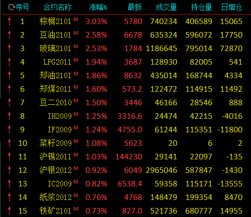热点栏目8月28日,国内期市早盘多数品种上涨,油脂涨幅居前,棕榈油涨逾3%,豆油涨逾2.5%,菜油涨近2%,能化品分化,玻璃涨逾2%,LPG涨近2%,PVC、低硫燃油、PTA跌逾1%;有色飘红,沪锡涨逾1%;黑色系中,动力煤涨1.6%。