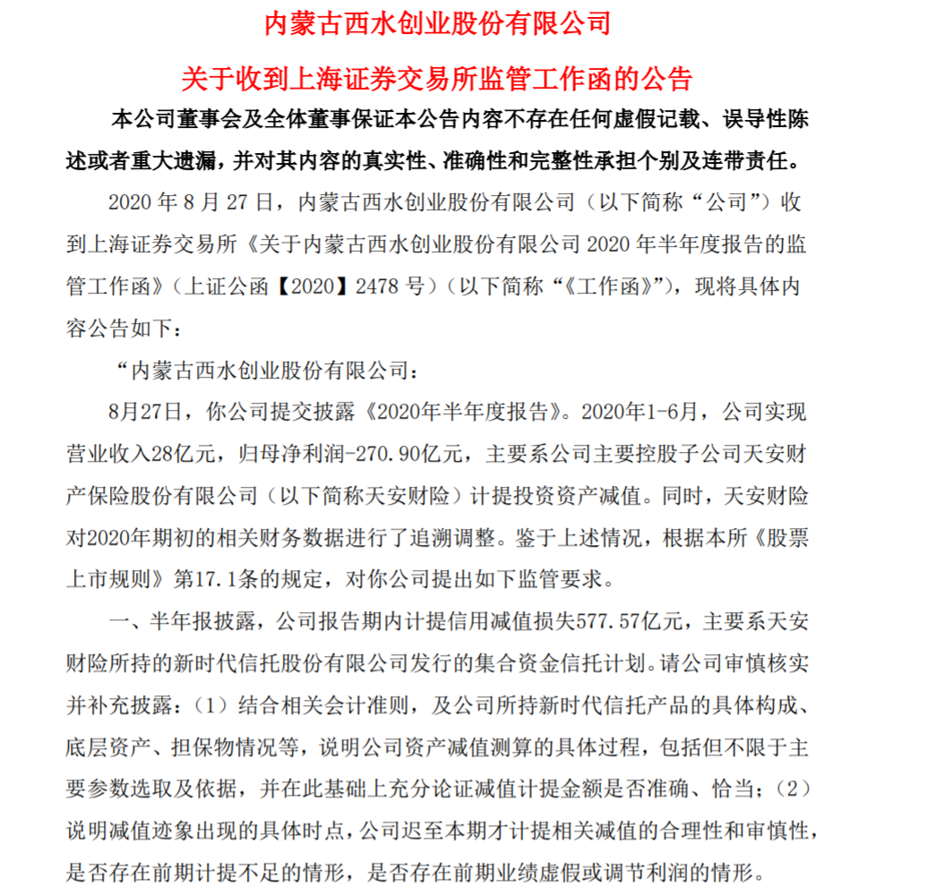 新闻连起来看,才能知道其所以然。用一段话概括以上公告,就是——“由于计提减值,西水股份上半年巨亏270.90亿元。这样的巨额亏损令上交所心生怀疑,对西水股份紧急发问:前期业绩是否虚假?是否有调节利润?”