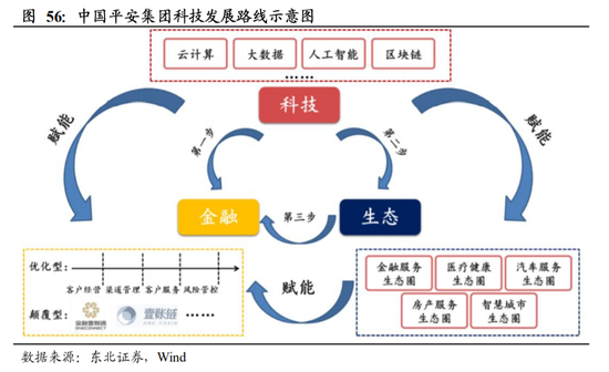 对标蚂蚁,如果说支付宝导入客户后,蚂蚁财富对其进行基金、保险、信贷等综合金融服务以二次挖掘价值。那么平安的路径则是通过原本全牌照的金融服务,将客户进行线上化迁移。同时,通过金融、医疗、房产、汽车和智慧城市五大生态圈的构建,将线上的用户向金融的客户进行转化,是OTO+生态导入版的“蚂蚁”。