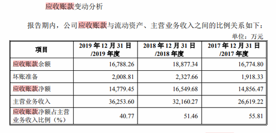 不仅现金流存在压力,元琛科技的应收账款仍然较高。报告期内,元琛科技的应收账款账面价值分别为1.48亿元、1.65亿元和1.47亿元,占当期主营业务收入比例分别为55.81%、51.46%、40.77%。