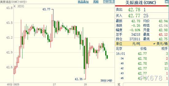 北京时间16:01,NYMEX原油期货下跌0.58%至42.78美元/桶;ICE布伦特原油期货下跌0.51%至45.37美元/桶。
