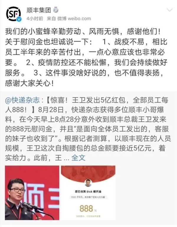 8月28日早间,顺丰员工意外收到了888元慰问金。