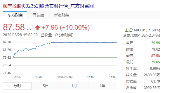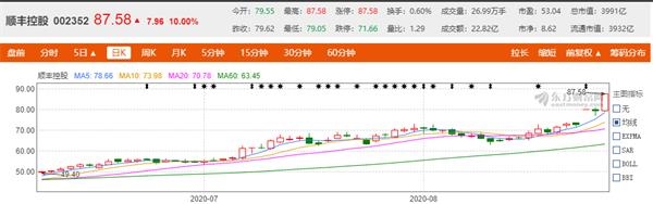 8月28日,顺丰再次涨停并创下87.58元的历史新高,市值逼近4000亿元,今年以来股价涨幅已达137.22%。