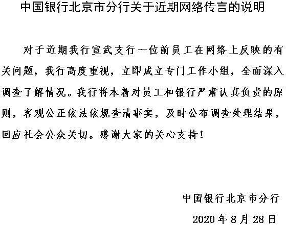 对此,中国银行北京市分行在8月28日回应称,对于近期该行宣武支行一位前员工在网络上反映的有关问题,该行高度重视,立即成立专门工作小组,全面深入调查了解情况。该行将本着对员工和银行严肃认真负责的原则,客观公正依法依规查清事实,及时公布调查处理结果。