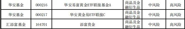 因而,在当前的市况下,工行大大提高了部分商品及金融衍生品的风险等级,让投资者提高风险意识。华安、汇添富三只黄金etf基金从中风险到高风险。