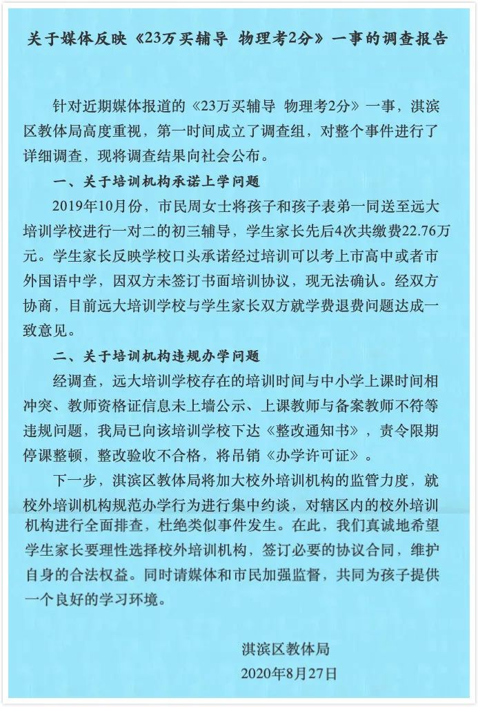 原标题:花23万元进辅导班,物理仅考2分!官方调查处理结果来了