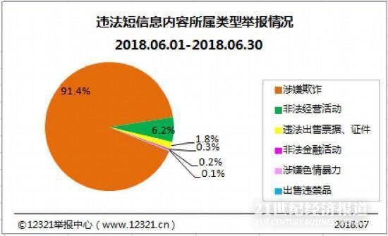 而在2018年6月份,12321举报中心公布的一次数据显示,其当月共收到举报短信2.3万件次中,内容涉嫌违法类的共0.8万件次,占比35%。