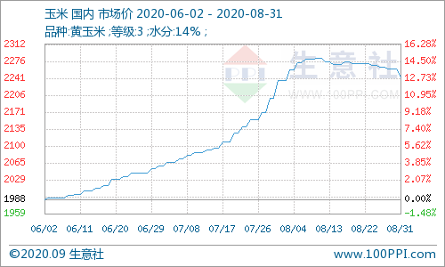 据生意社监测,8月份国内玉米价格冲高后震荡回落,8月1日3等黄玉米均价为2237.14元/吨,8月31日均价为2244.29元/吨,小幅上涨0.32%。