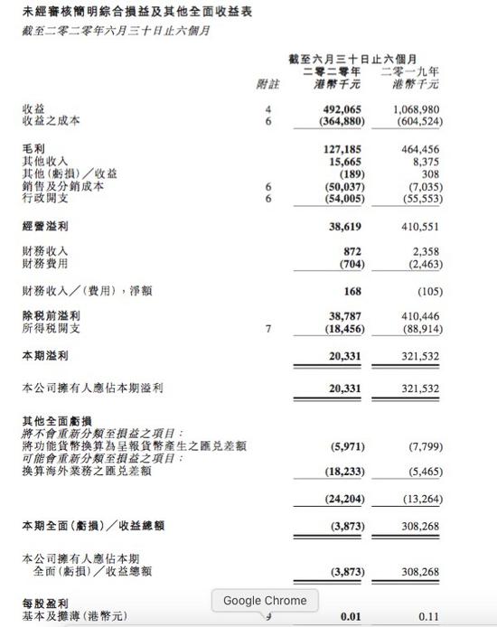 根据欢喜传媒半年报,2020年上半年,公司实现营收4.92亿港元,较去年同期下滑54%;净利润为0.2亿港元,同比下滑94%。欢喜传媒表示,因受疫情影响,公司投资的多部电影需要延迟在院线上映,导致今年期内的电影院线上映收益大幅减少。