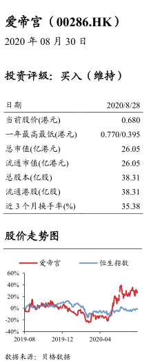 2020 年上半年由于新冠疫情影响,大部分行业因疫情停业,但月子服务不能延期消费、具有刚需特性,因此疫情期间爱帝宫旗下所有月子中心正常营业,除因防疫要求拒收潜在高风险客户外其余客户均正常入住,需求仍然保持强劲。同时在疫情的催化下,行业加速洗牌,实力强、品牌优的月子中心保持强劲发展势头,实力差、品牌弱的月子中心加速退出市场,带来整合机会。同时,疫情对经济造成了冲击,各种物业的空置率上升、物业价格下降,公司将把握机遇、逆势扩张,进一步提升市场份额。上半年单独月子服务业(深圳爱帝宫)营收 3.13 亿港元(+12.3%),净利润 0.48 亿港元(+13.1%),毛利率 41.4%,净利润率 15.3%。