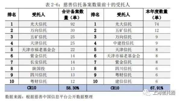 导读:从受托信托机构来看,本年度慈善信托备案数量最多的两家受托人为光大信托和五矿信托,备案数量分别为74单和12单,四年合计来看,慈善信托备案数量最多的两家受托人为光大信托和万向信托。