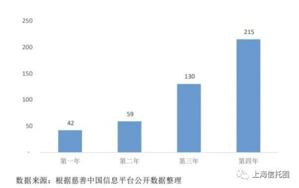 此前,《慈善法》实施第一年,(2016年9月1日-2017年8月31日,以此类推)全国共备案42单慈善信托;第二年全国共备案59单,同比增长了40%;第三年共备案130单,同比增长了120.34%;本年度则共备案215单,同比增长65.38%。